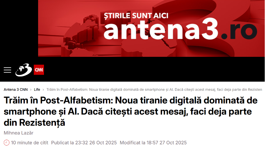 Constantin Vică, philosopher, researcher, and Associate Professor at the Faculty of Philosophy, University of Bucharest, was featured in a recent article on Antena 3 CNN, “We Live in Post-Literacy: The…